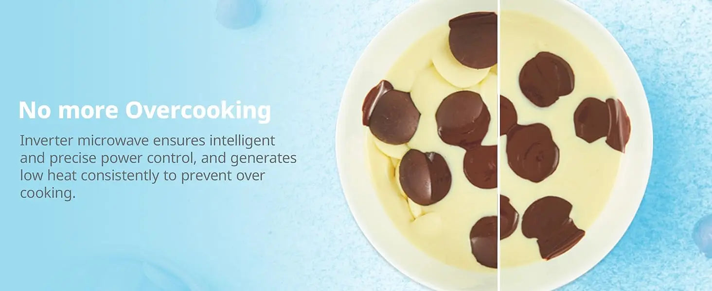· The inverter technology enhances cooking performance, allowing for even defrosting and heating while eliminating the risk of overcooking.