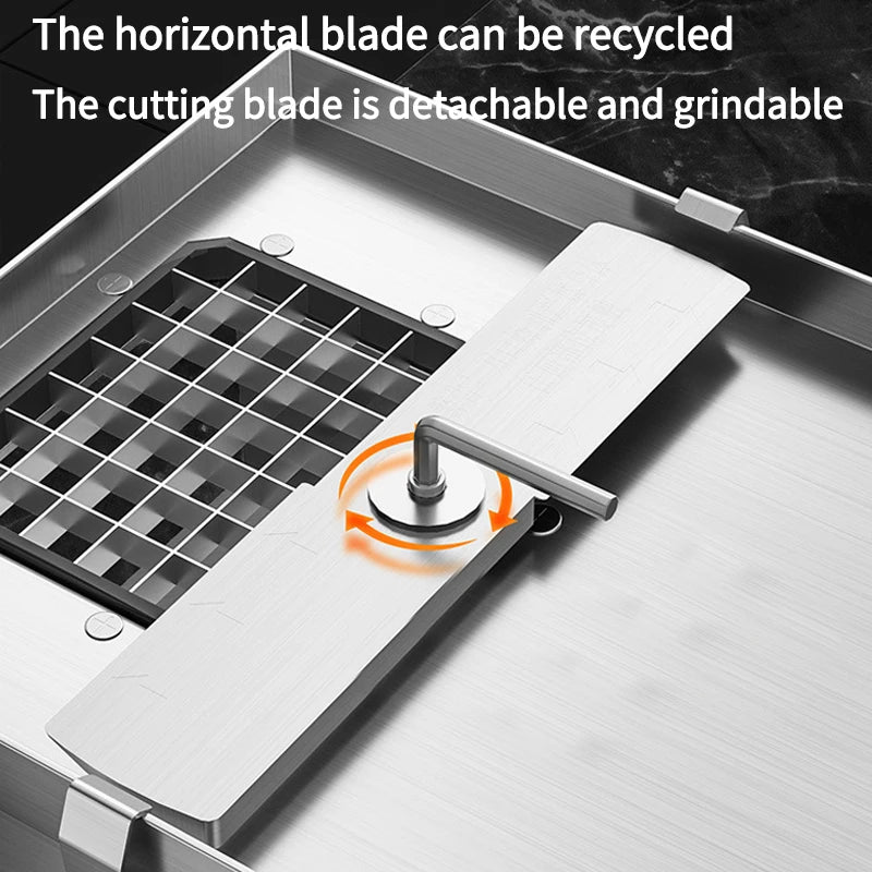 3-in-1 strip, dice & shred in seconds—13mm cubes for potatoes, onions, carrots, fruit. No knives, no tears.