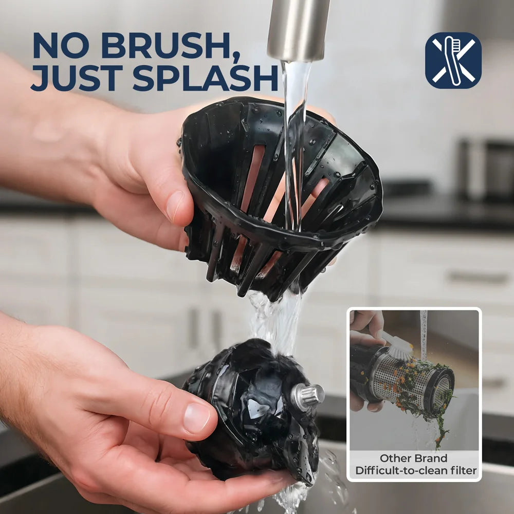 No-scrub juicing—filter-free auger, 45RPM cold press, whole-apple feed, reverse anti-clog, dishwasher-safe parts in 30s.