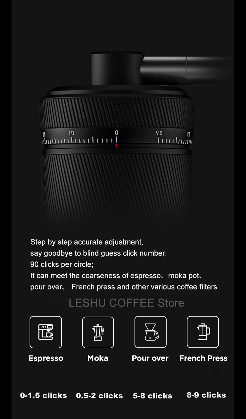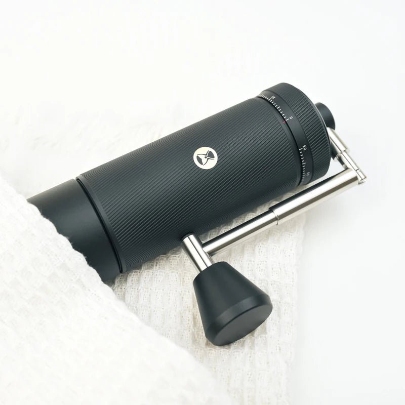 Espresso-quality grind in your pocket—CNC-cut stainless conical burrs, 20g capacity, 38mm diameter, foldable handle, 430g all-steel body.