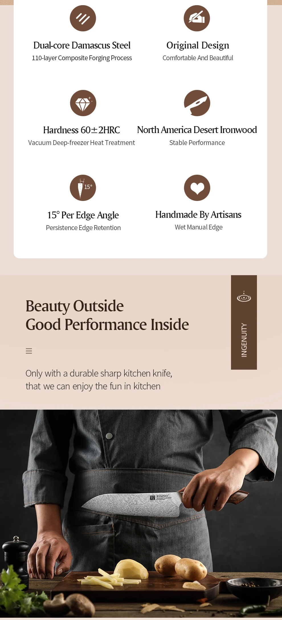 10Cr15CoMoV + 9Cr18MoV Dual Core Damascus Steel, which is characterised by the absence of a steel core and is closer to traditional Damascus steel. The steel is forged with 110 layers of composite forging, which provides better sharpness and durability due to hybrid forging.After vacuum deep-cooling heat treatment, the hardness can reach 58-62 HRC